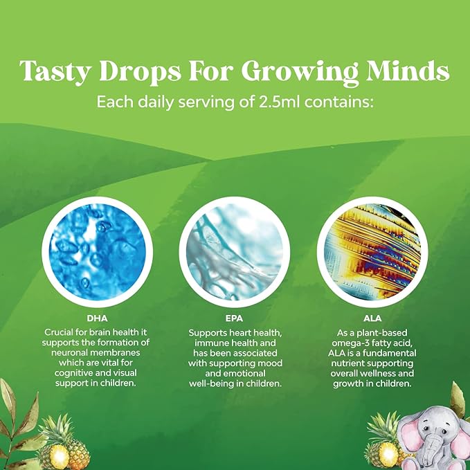 - Vegan Omega 3 Supplement - Unlike many childrens DHA supplements our formula is completely plant based with algae omega 3 DHA and EPA from Organic flax seed oil Natural algae oil and Organic MCT oil