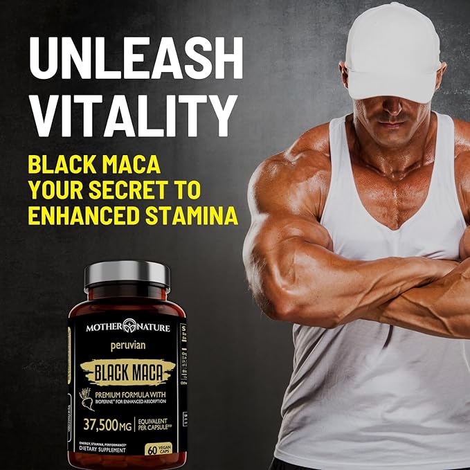 Mother Nature Black Maca Root Capsules – 50:1 37,500mg Peruvian Black Maca Root for Men, Women with Bioperine – Maca Root Capsules to Boost Stamina, Performance, Energy, Muscle Gain – 60-Count