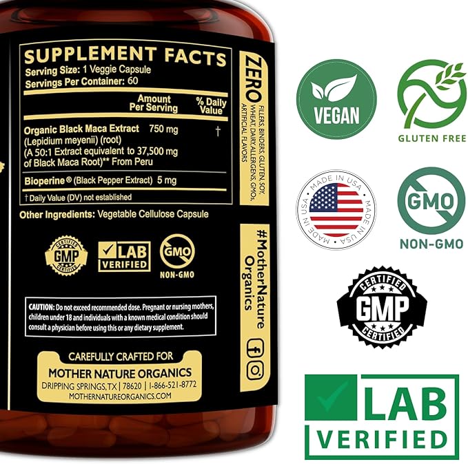 - Quality Assured, Made in the USA: The Mother Nature maca supplement is made in the USA, in a GMP-certified facility with pure ingredients extracted from natural sources, without any fillers, preservatives, additives, artificial ingredients or GMOs. The supplement is also vegan-friendly and cruelty-free.