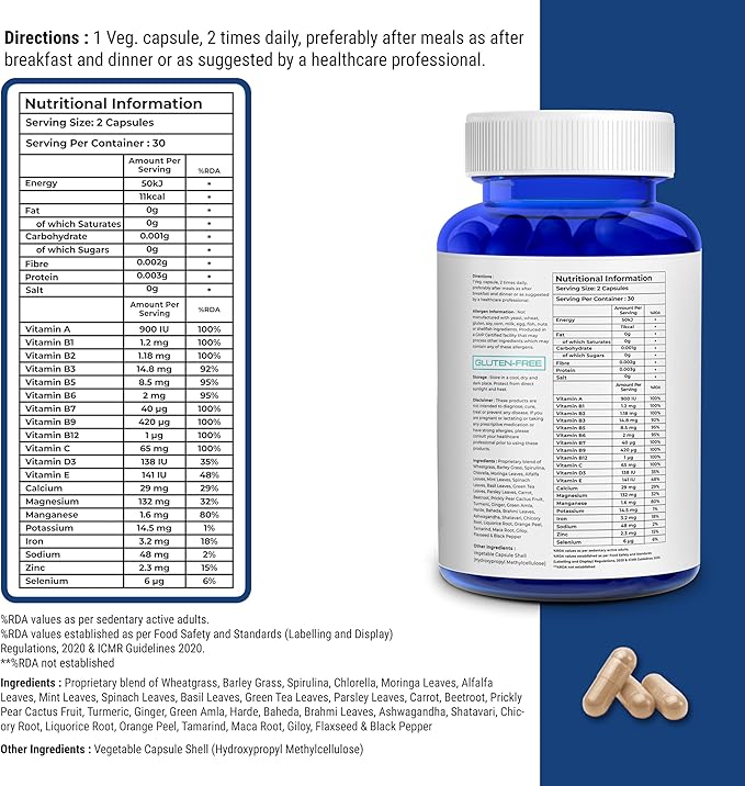 - Primary Supplement Type : Proprietary blend of Wheatgrass, Barley Grass, Spirulina, Chlorella, Moringa Leaves, Alfalfa Leaves, Mint Leaves, Spinach Leaves, Basil Leaves, Green Tea Leaves,, Prickly Pear Cactus Fruit, Turmeric, Ginger, Green Amla, Harde, Baheda, Brahmi Leaves, Ashwagandha, Shatavari,, Chicory Root, Liquorice Root, Orange Peel, Tamarind, Maca Root, Giloy, Flaxseed & Black Pepper, Parsley Leaves, Carrot, Beetroot. Proprietary blend of Wheatgrass, Barley Grass, Spirulina, Chlorella, Moringa Leaves, Alfalfa Leaves, Mint Leaves, Spinach Leaves, Basil Leaves, Green Tea Leaves,, Prickly P… See more