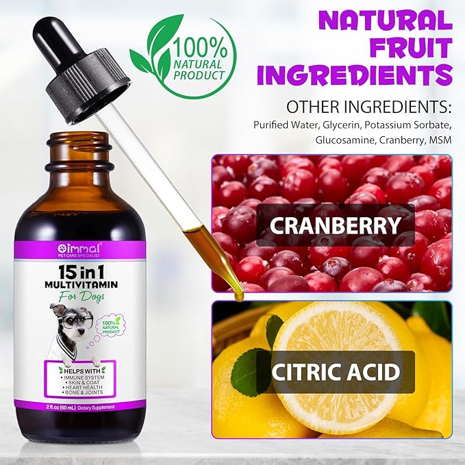Dog Multivitamin - 15 in 1 Multivitamin Drops for Dogs, Dog Vitamins with Glucosamine Cranberry Supports Joint & Digestion, Skin & Coat, Pets Supplements for Dogs of All Ages, Bacon Flavor - 2 Fl Oz
