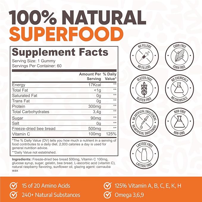 Bee Bread Gummies - Fermented Bee Pollen & Honey, 100% Natural Multivitamin, Superfood for Energy, Metabolism, Sleep, Recovery, Immunity | Rich in Vitamin C, B, Amino Acids, Antioxidants, Minerals