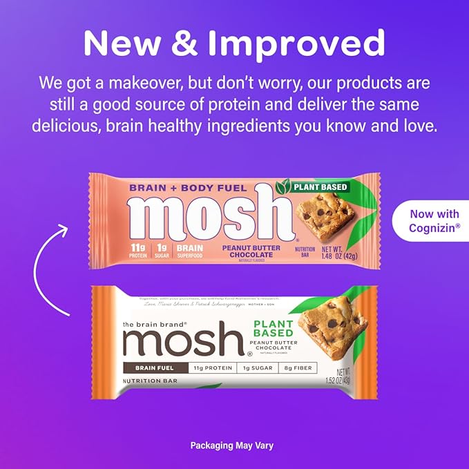 - MIND-BLOWING INGREDIENTS - MOSH clean protein bars are loaded with brain-enhancing nutrients like lion’s mane, ashwagandha, omega 3's, flaxseed, vitamin B12, and D3. Using a science-backed formulation called Cognizin, we provide nutritious and tasty bars for an active and busy lifestyle. They are perfect as a healthy midday snack for kids or a great addition to a college care package.