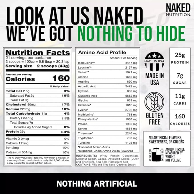 - NAKED MEANS NOTHING ARTIFICIAL: 100% Grass Fed Whey, Coconut Sugar, Cacao, Alkalized Cocoa, Sea Salt and Potassium Salt. Naked Double Chocolate Whey contains no artificial sweeteners, flavors, or colors and is GMO-Free, No rBGH or rBST, Soy Free and Gluten-Free.