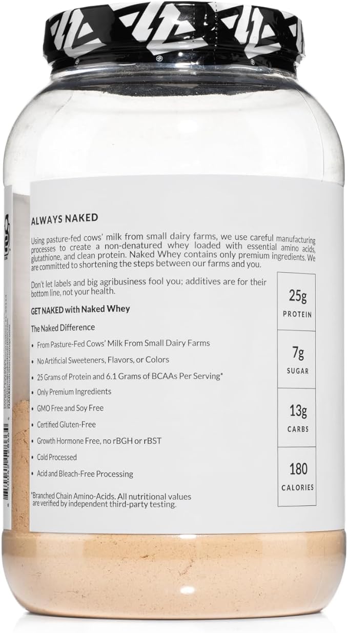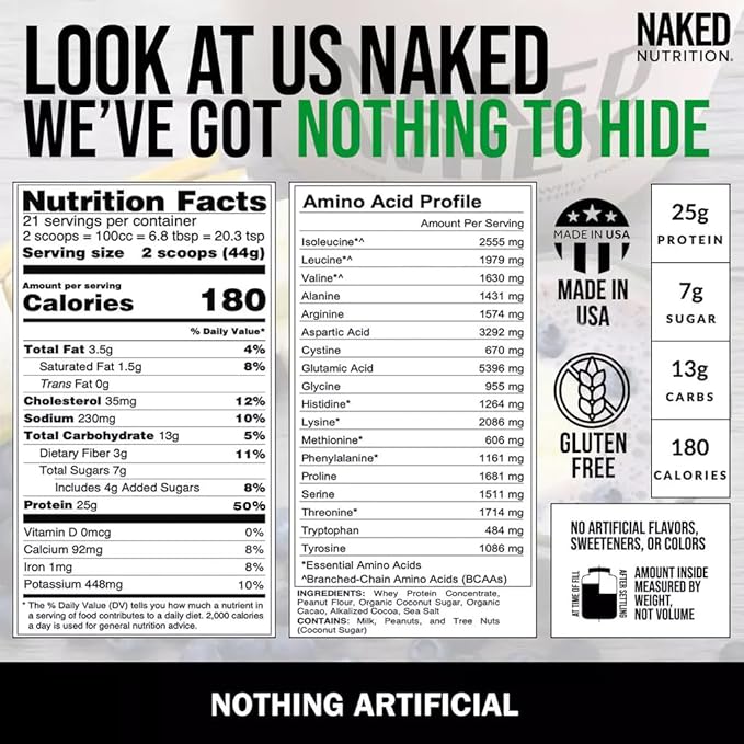 - NAKED MEANS NOTHING ARTIFICIAL: 100% Grass Fed Whey, Peanut Flour, Organic Coconut Sugar, Organic Cacao, Alkalized Cocoa, and Sea Salt. Naked Chocolate Peanut Butter Whey contains no artificial sweeteners, flavors, or colors and is GMO-Free, No rBGH or rBST, Soy Free and Gluten-Free.