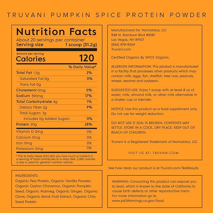 Truvani Vegan Pea Protein Powder | Pumpkin Spice | 20g Organic Plant Based Protein | 20 Servings | Keto | Gluten & Dairy Free | Low Carb | No Added Sugar