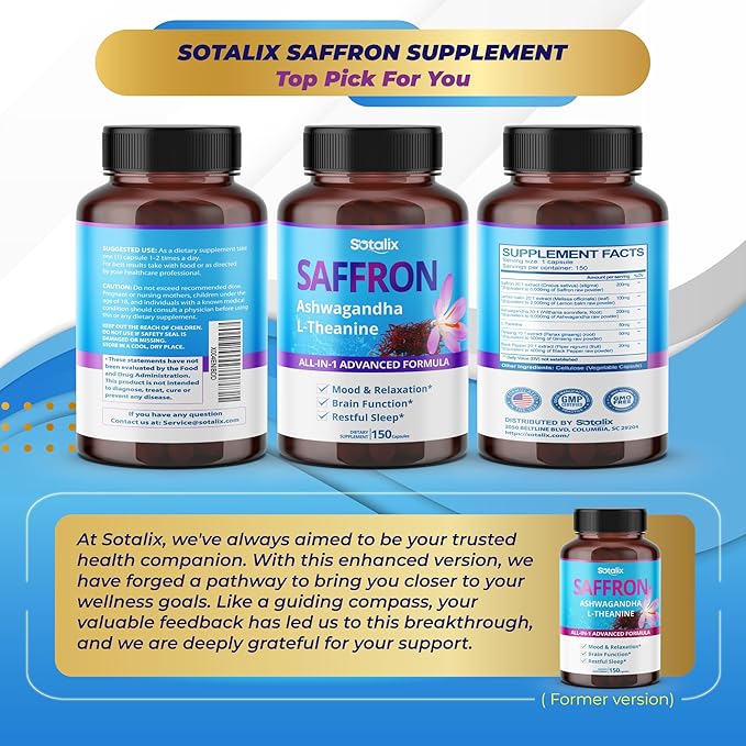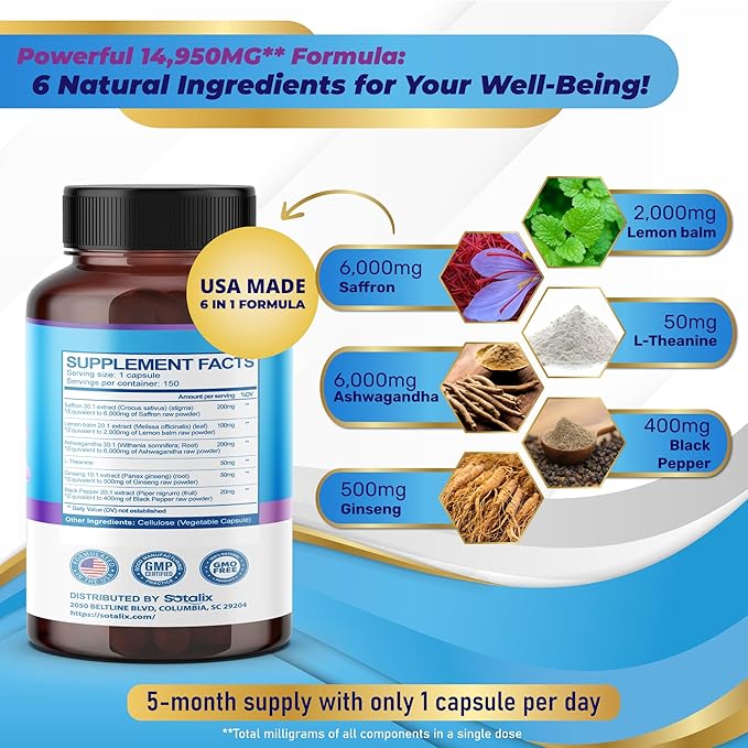 - Sotalix Saffron Supplement offers a unique 6-in-1 blend of premium ingredients: Saffron, Lemon Balm, Ashwagandha, L-Theanine, Ginseng, and Black Pepper for optimal wellness benefits in each capsule