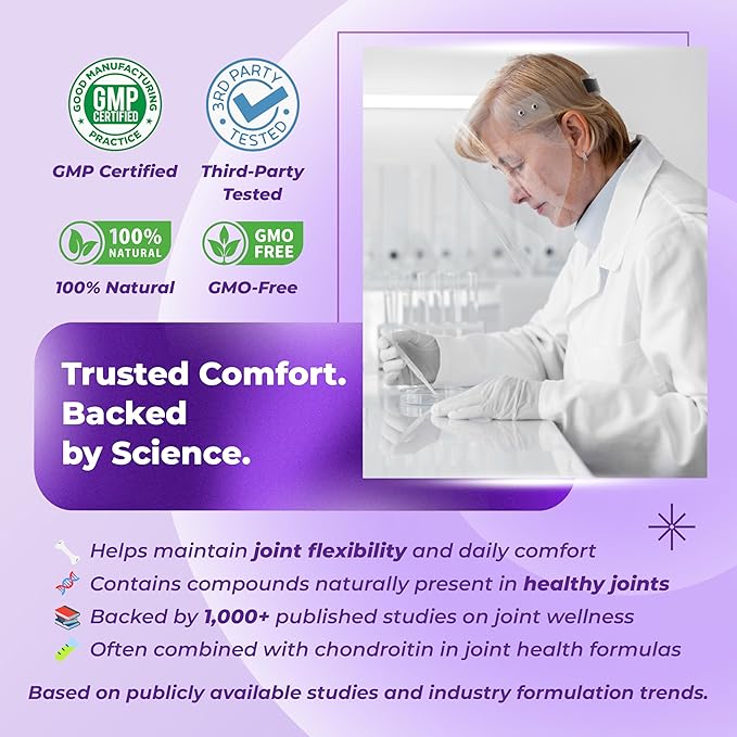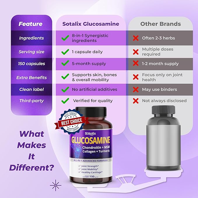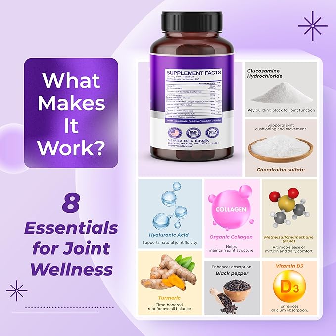 - Unique 8-in-1 Formula: This supplement includes 8 premium ingredients per capsule, such as Vitamin D3, samine, Chondroitin, MSM, Turmeric, Hyaluronic Acid, Organic Collagen Complex (Types I & III), and Black Pepper to enhance absorption