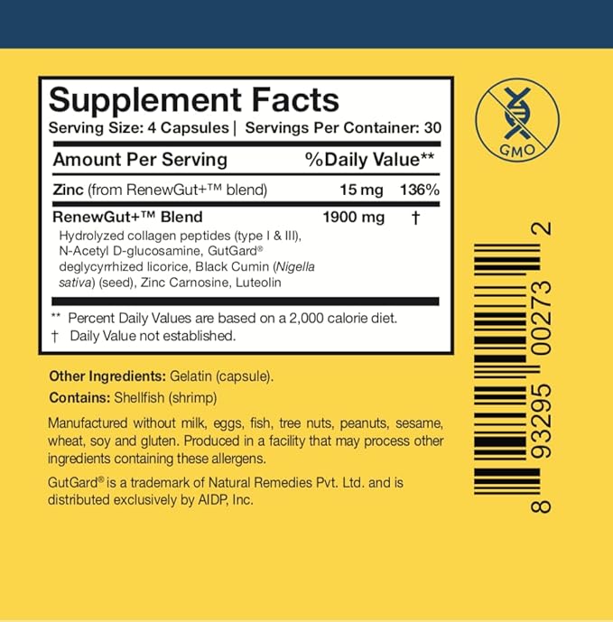 Researched Nutritionals RenewGut+ - GI Complex to Support Gut Lining, Healthy Histamine Levels & Digestive Health - Collagen Peptides, Zinc Carnosine, DGL & N Acetyl Glucosamine (120 Capsules)