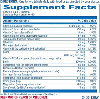 - The multivitamin contains vitamins A, B complex, C, D, and E. It also contains minerals like choline, calcium, phosphorus, iodine, magnesium, zinc, selenium, copper, manganese, chromium, and more.