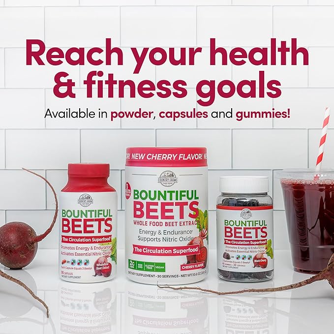 - NATURAL ENERGY. Country Farms Bountiful Beets Capsules support natural energy which may help boost athletic performance. Start implementing Bountiful Beets Capsules to your routine to help boost your workout, performance and overall health.