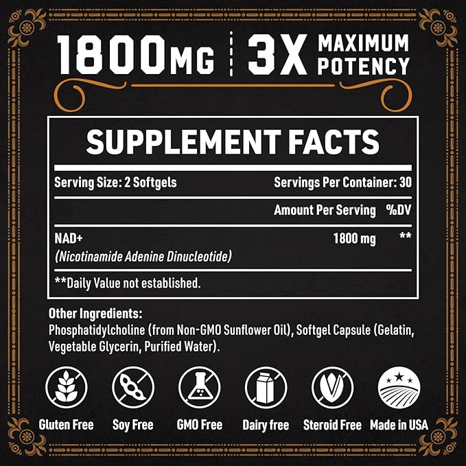 - ✔ 1800 MG Liposomal NAD Supplement Formulation: With a dosage of 1800 MG per serving, our 98% pure NAD Supplement may boost energy levels, cellular repair, mental clarity, and aging defense. Notably, our Liposomal NAD is Gluten-free, Soy-free, and GMO-free, providing you with a clean and natural option for your wellness journey. Experience the amplified benefits of NAD+ Supplement without unwanted additives, and take your well-being to new heights.