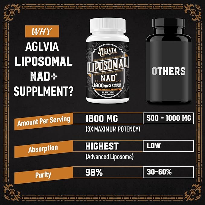 - ✔ Maximum Efficiency: AGLVIA 1800 mg Liposomal NAD Supplement embodies uncompromising efficacy. Each calibrated serving of 1800 mg reflects our dedication to impactful NAD Plus support. This dosage empowers comprehensive cellular functions, metabolic equilibrium, and resilience. Whether seeking peak performance or overall well-being, our NAD Plus supplement propels you toward goals with precision.