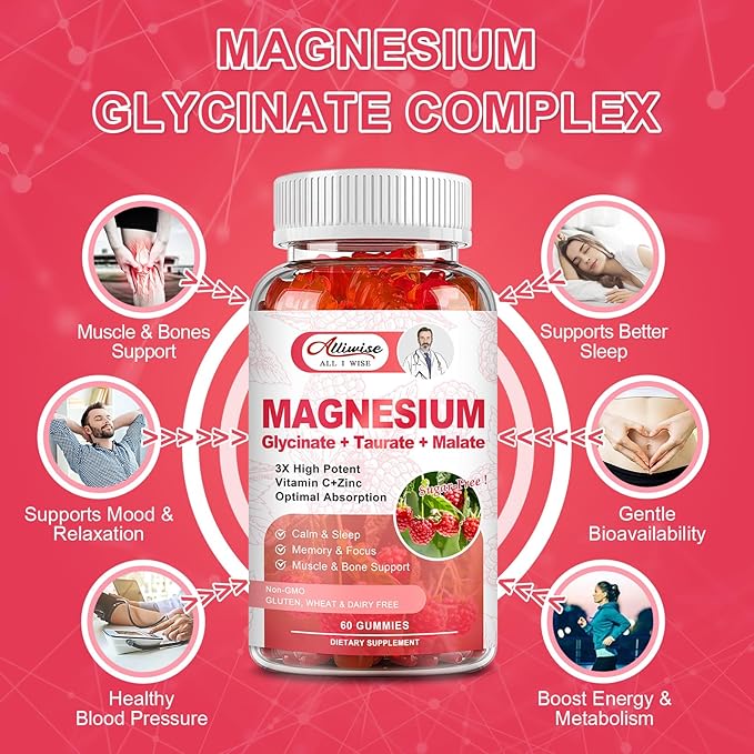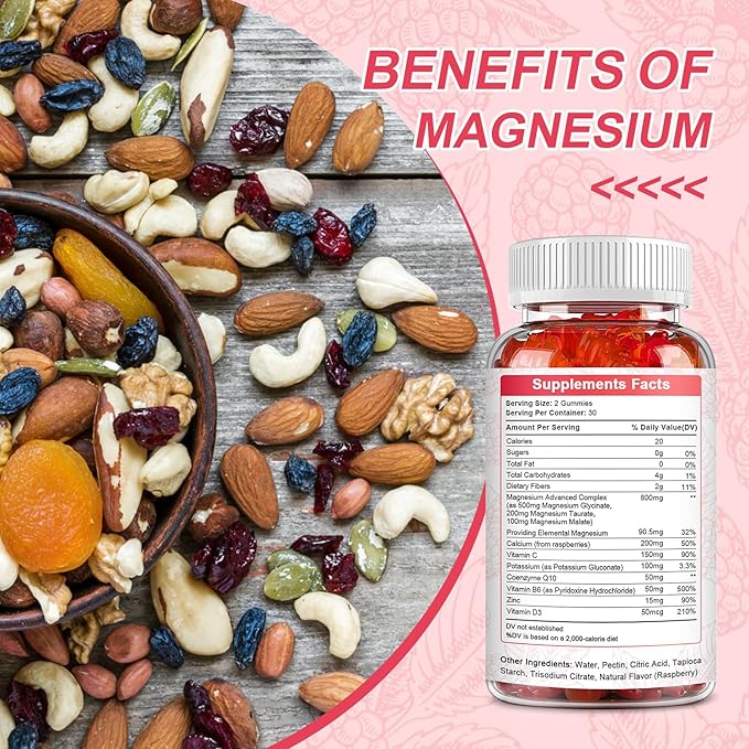 - Overall Health & Nutrient Metabolism: Our calm magnesium gummies contain a powerful combination of Magnesium Glycinate 500mg, Magnesium Taurate 200mg, Magnesium Malate 100mg, Vitamins D, C, B6, Calcium, Potassium, and Zinc. This comprehensive blend supports overall health, promotes nutrient metabolism, enhances brain function, and boosts immunity.