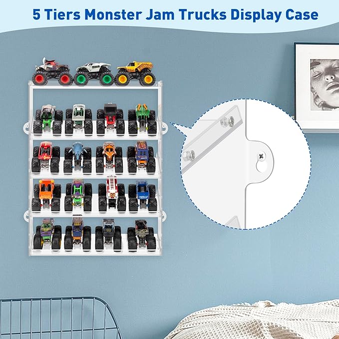 - 5 Levels of Display: This monster truck display case features five levels, each meticulously designed to safely and stylishly display your monster jam trucks. With a capacity of up to 20 trucks, you'll have plenty of room to display your collection.