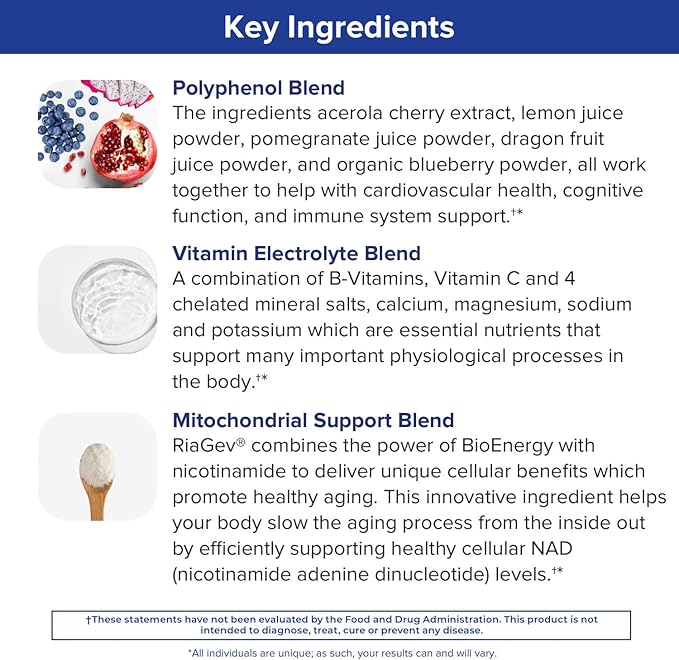 - Polyphenol Power: Vital Recharge harnesses the power of polyphenols, which are plant-based compounds known for their potent antioxidant properties. Additionally, polyphenols have been associated with various health benefits, including cardiovascular health, cognitive function, and immune system support.