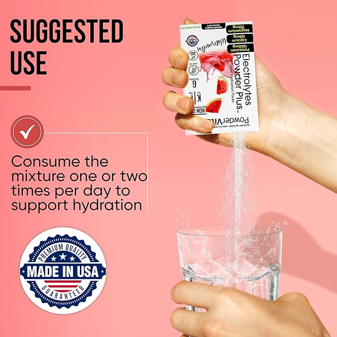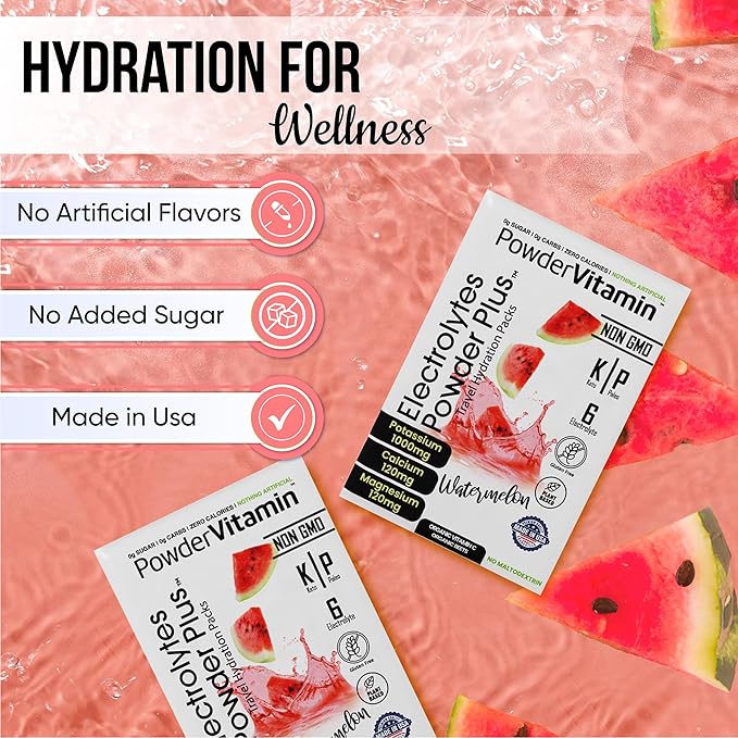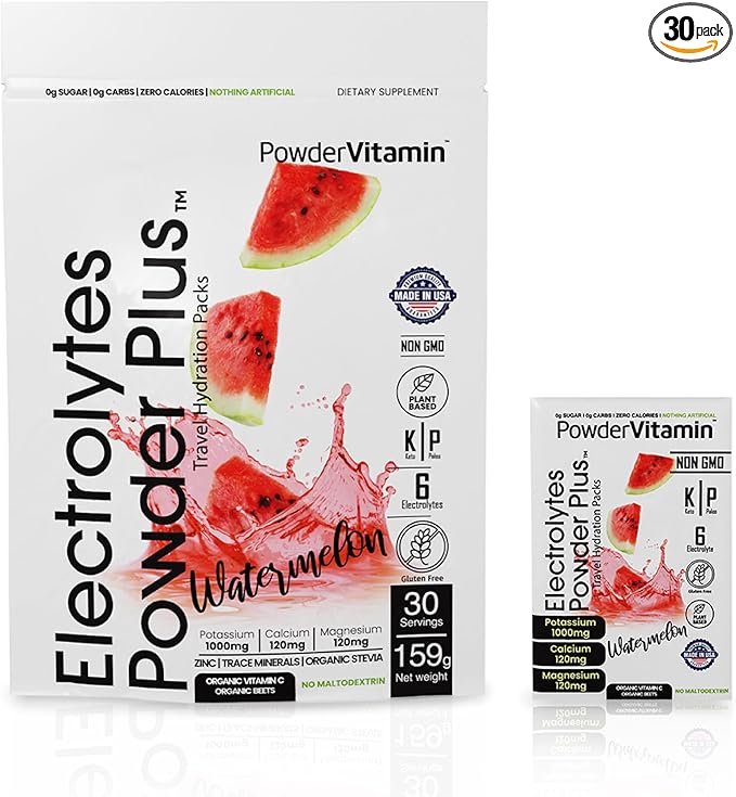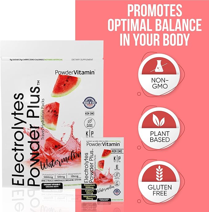 - Electrolyte Powder - Electrolytes Powder Plus contains 1000 mg of potassium opposed to only 250 mg in other brands. Additional we offer a unique flavor and blend of Magnesium, Calcium, Organic Pink Himalayan salt. Our delicious and hydrating blend of Watermelon flavor includes 30 hydration packets for exercise, travel, or long nights. PowderVtmain Electrolytes Powder plus travel hydration packets has you covered.