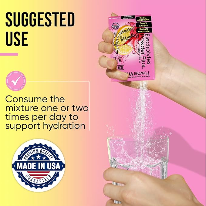 - Electrolyte Powder - Electrolytes Powder Plus contains 1000 mg of potassium opposed to only 250 mg in other brands. Additional we offer a unique flavor and blend of Magnesium, Calcium, Organic Pink Himalayan salt. Our delicious and hydrating blend of raspberry Lemonade flavor includes 30 hydration packets for exercise, travel, or long nights. PowderVtmain Electrolytes Powder plus travel hydration packets has you covered.