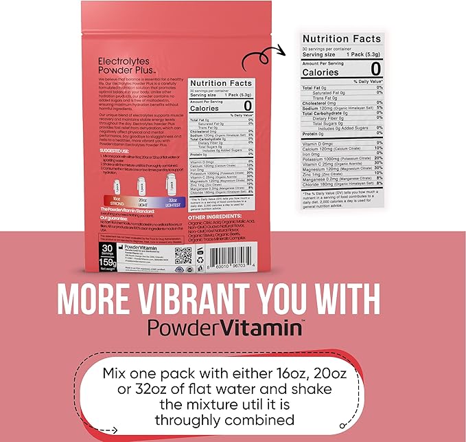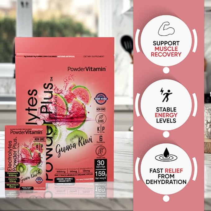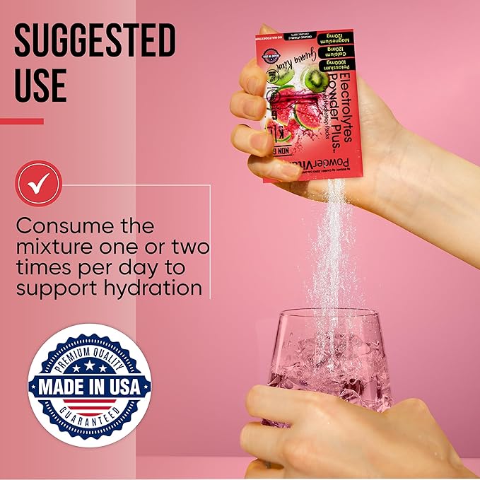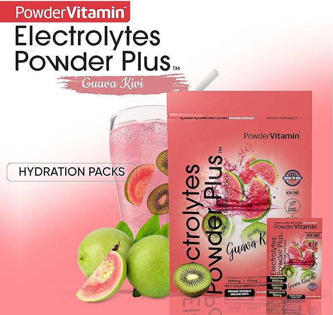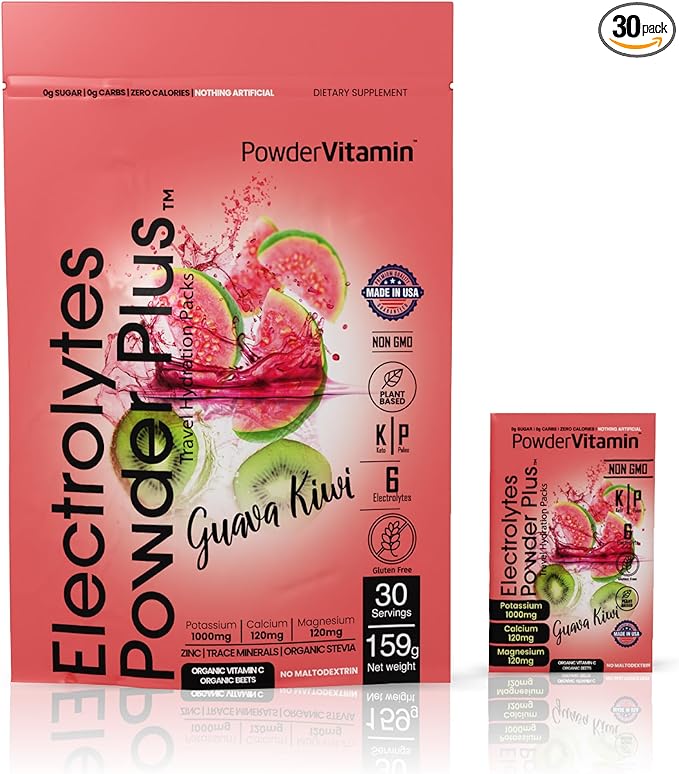 - Electrolyte Powder - Electrolytes Powder Plus contains 1000 mg of potassium opposed to only 250 mg in other brands. Additional we offer a unique flavor and blend of Magnesium, Calcium, Organic Pink Himalayan salt. Our delicious and hydrating blend of Guava Kiwi flavor includes 30 hydration packets for exercise, travel, or long nights. PowderVtmain Electrolytes Powder plus travel hydration packets has you covered.