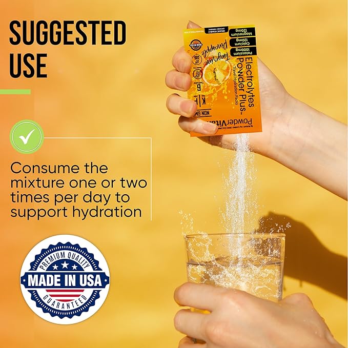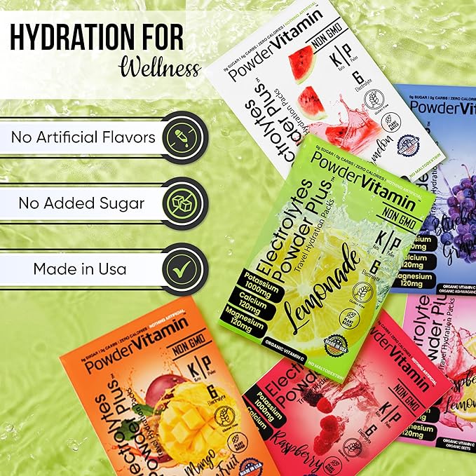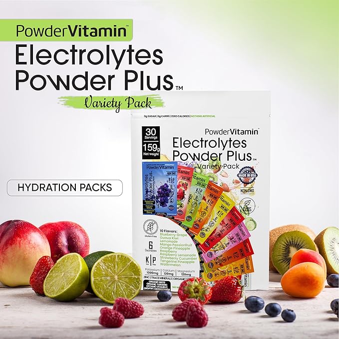 - Electrolyte Powder - Electrolytes Powder Plus contains 1000 mg of potassium opposed to only 250 mg in other brands. Additional we offer a unique flavor and blend of Magnesium, Calcium, Organic Pink Himalayan salt. Our delicious and hydrating blend of Variety flavor includes 30 hydration packets for exercise, travel, or long nights. PowderVtmain Electrolytes Powder plus travel hydration packets has you covered.