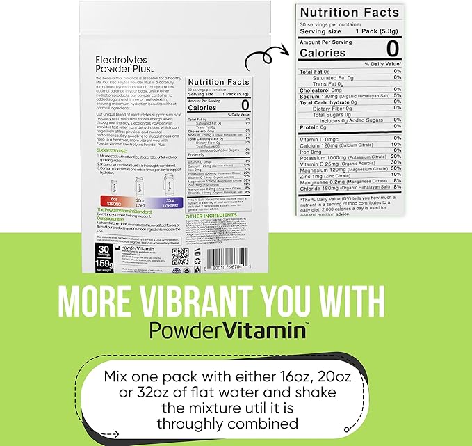 - Keep Yourself Hydrated – Without added calories. PowderVitamin Sugar-Free Electrolyte Powder Plus aids in per workout & post workout muscle recovery with potassium and essential mineral salts.
