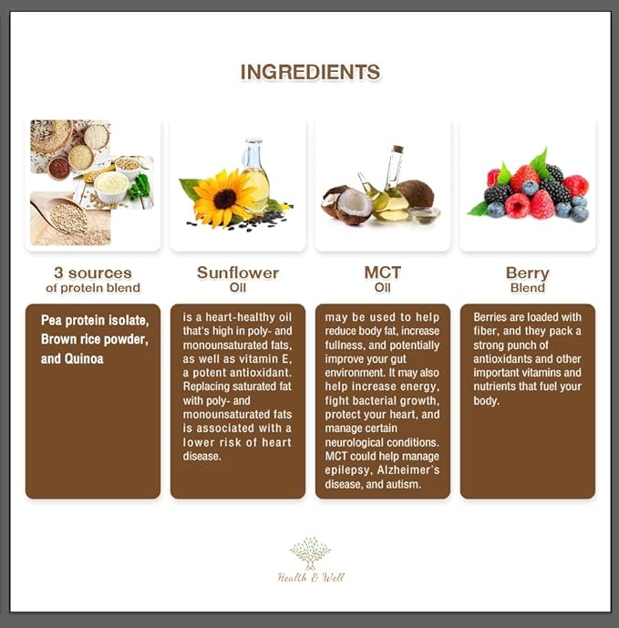- Three sources of protein: Quinoa, Pea Protein Isolate and Brown Rice Powder.