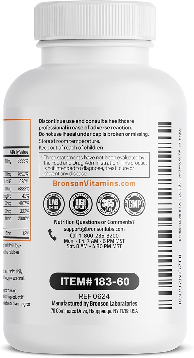 - Contains All B Vitamins: Bronson’s Super B 100 Vitamin B-Complex formula contains Vitamin B1, B2, B3, B6, Folic Acid, B12, Biotin, and Pantothenic Acid all within one sustained release tablet. Our Sustained Release tablets slowly release to provide a steady stream of B Vitamins to support energy levels throughout the day.*