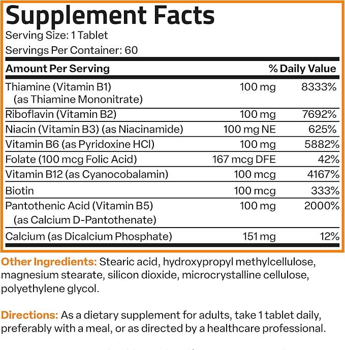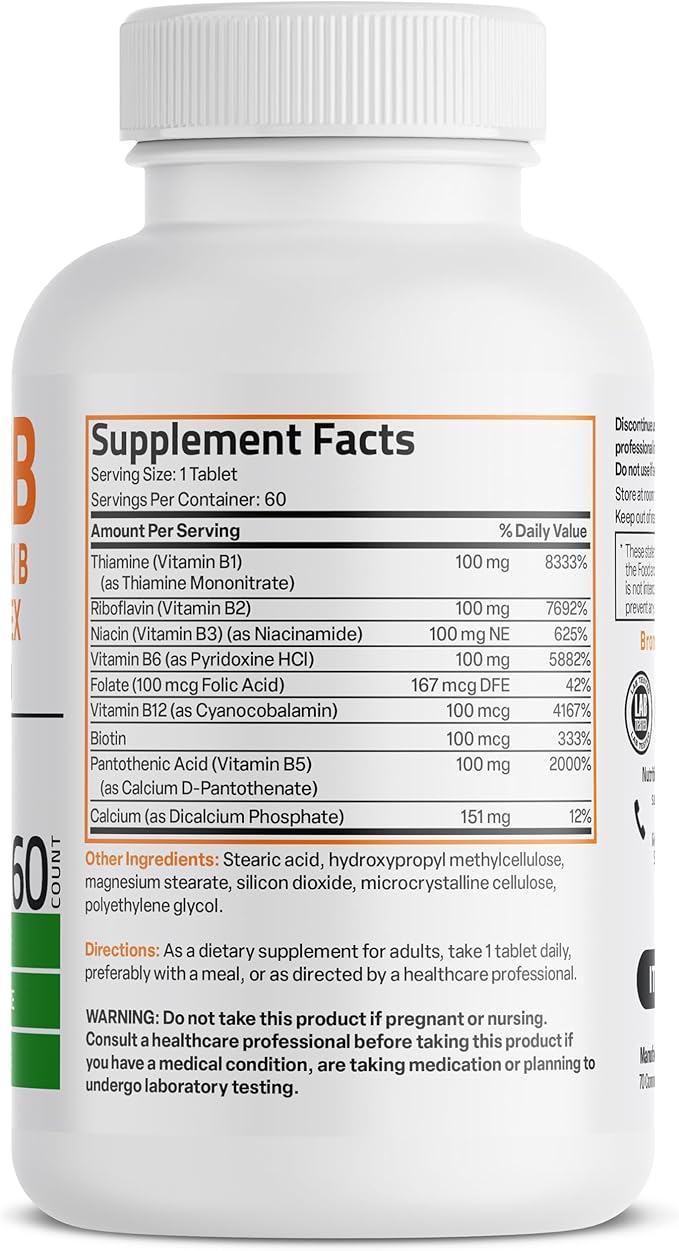 Bronson Vitamin B 100 Complex High Potency Sustained Release (Vitamin B1, B2, B3, B6, B9 - Folic Acid, B12), 60 Tablets