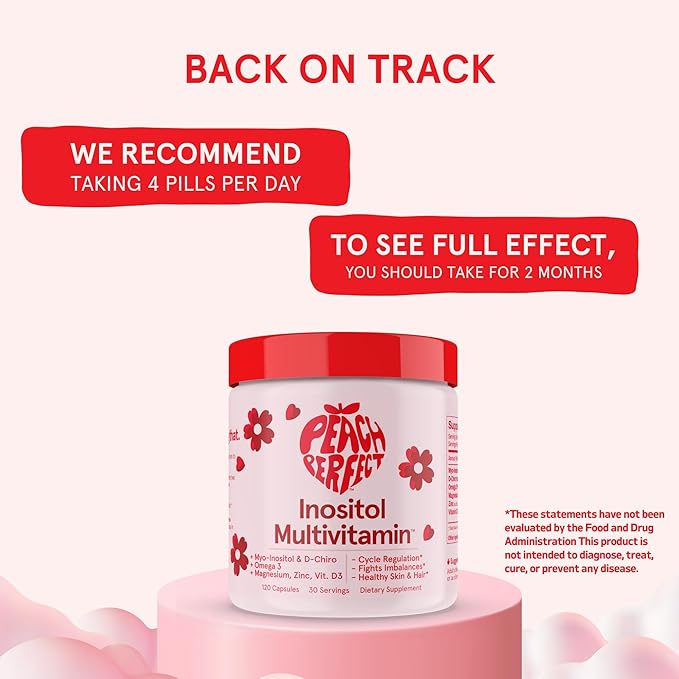 - All-in-One Inositol Multivitamin Supplement: Peach Perfect’s inositol supplement blends myo-inositol, d-chiro inositol, Omega-3, zinc, magnesium, and vitamin D3 in a comprehensive formula. Unlike standard inositol powder or inositol gummies, this potent inositol multivitamin is designed to provide full-spectrum support for energy, mood, and cycle balance. Ideal for those seeking a premium myo-inositol & d-chiro inositol supplement.