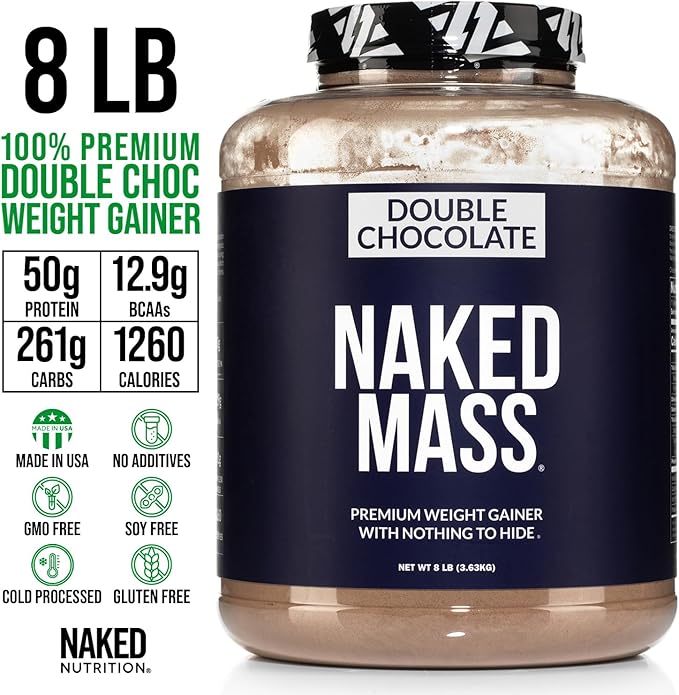 Naked Double Chocolate Mass - 1,260 Calories, 50G Protein, Nothing Artificial. All Natural Weight Gainer Protein Powder - 8Lb Bulk, GMO Free, Gluten Free & Soy Free
