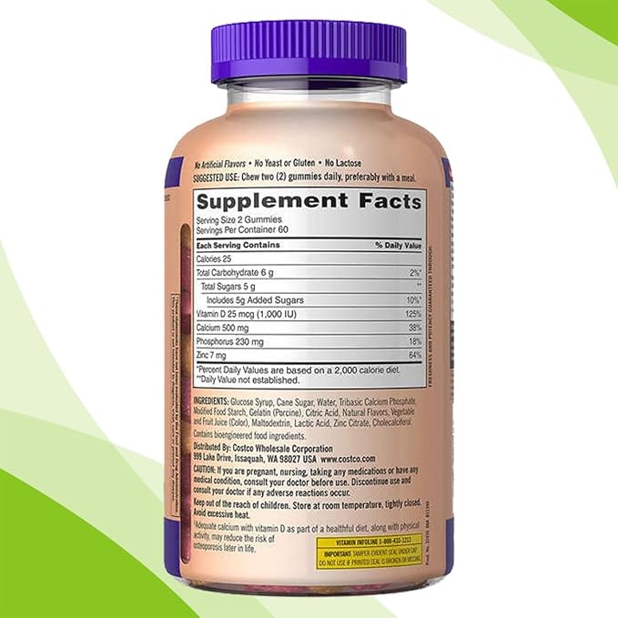 - A serving of just 2 gummies delivers 500 mg of Calcium, 25 mcg (1000 IU) of Vitamin D, and 7 mg of Zinc.