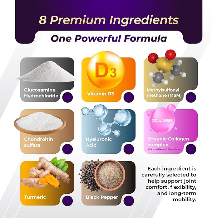 - Unrivaled Formula: GriMed Glucosamine presents a unique combination of 8 precious herbs neatly packed into every capsule. These ingredients encompass Vitamin D3, Glucosamine Hydrochloride, Methylsulfonylmethane, Chondroitin, Hyaluronic Acid, Organic Collagen complex, Turmeric, and Black Pepper. This special blend significantly elevates your overall well-being. No need to manage various supplements anymore – a single daily Grimed Glucosamine capsule delivers remarkable outcomes.