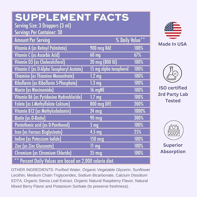 - Easy to Use and Delicious: Our Liposomal Women's Multivitamin comes in easy-to-take liquid drops. Just mix 3ml (3droppers) in 8 ounces of cold water or your favorite beverage and drink. Plus, our Natural Berry flavor ensures a pleasant experience every time.