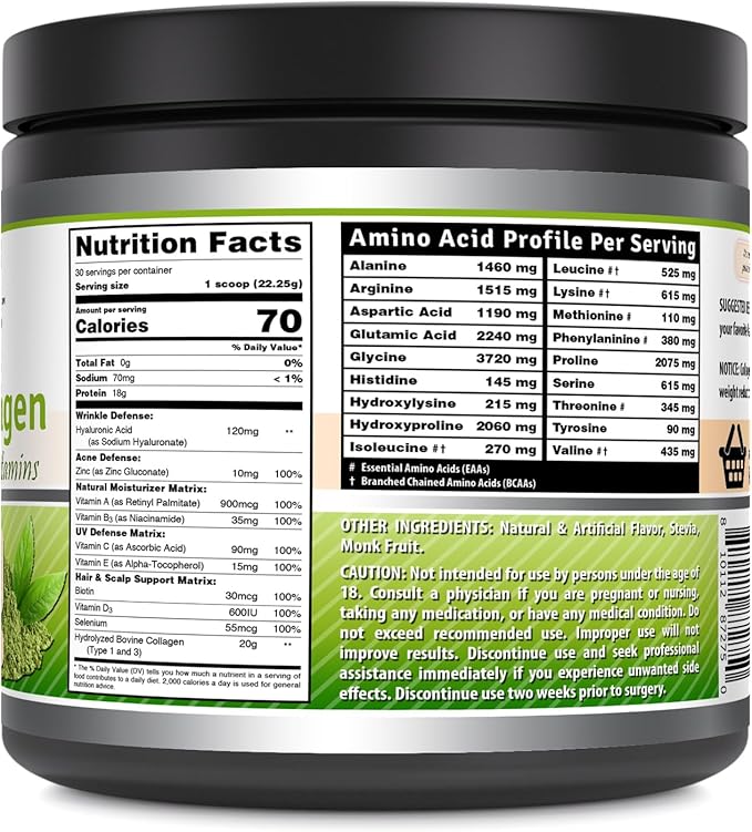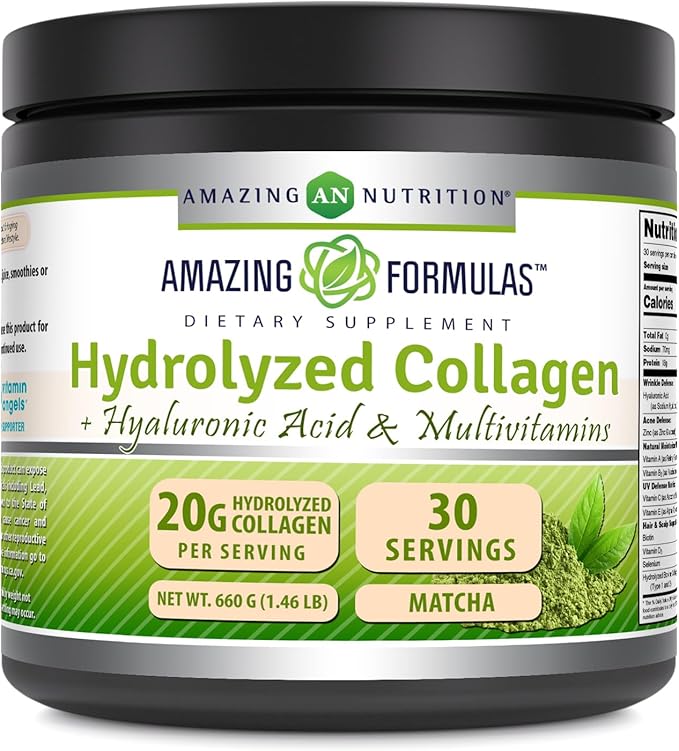 Amazing Formulas Hydrolyzed Collagen with Hyaluronic Acid & Multivitamins Supplement | 30 Servings Powder | 660 Grams | Japanese Matcha Flavor