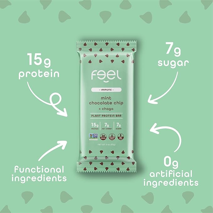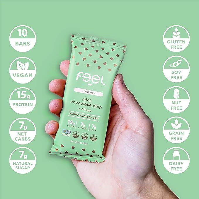 Feel Vegan Protein Bars | Mint Chocolate Chip | Keto | Gluten Free | Organic | Chaga Mushroom | 15g Plant Protein | Low Carb | High Protein | Dairy Free | Low Sugar | Grain Free | Nut Free | Soy Free