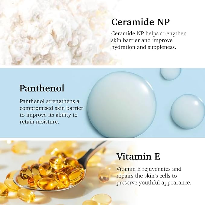 - -[KEY INGREDIENTS] include Ceramide NP that forms a protective and hydrating layer on the skin’s surface to help strengthen skin barrier and improve hydration and suppleness, Panthenol that moisturizes and soothes and strengthens a compromised skin barrier to improve its ability to retain moisture and Vitamin E that is known to rejuvenate and repair the skin’s cells to preserve youthful appearance.