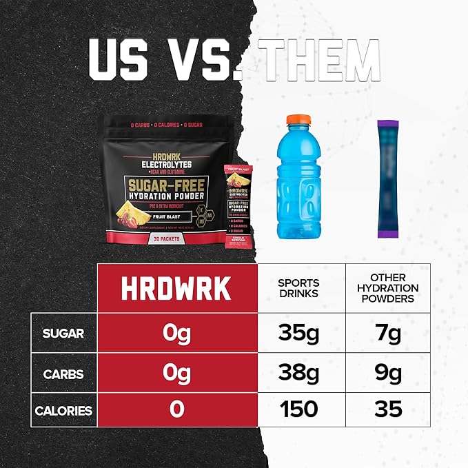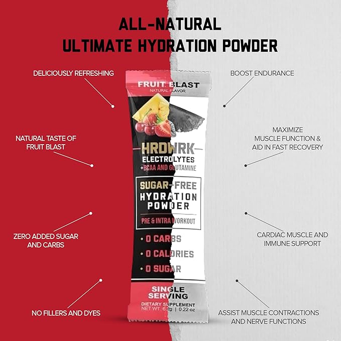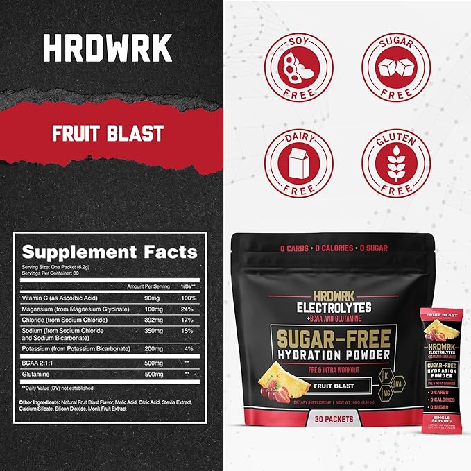 HRDWRK Electrolytes Powder Packets with Magnesium, Potassium Sodium, Keto Hydration Packets - BCAA Electrolyte Powder Packets with Glutamine, 30 Electrolytes Powder Packets Sugar Free (Fruit Blast)