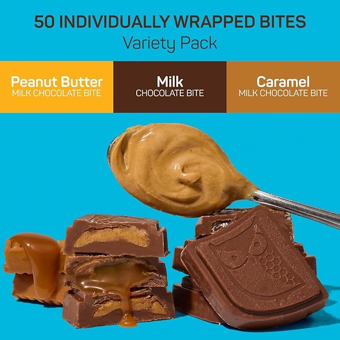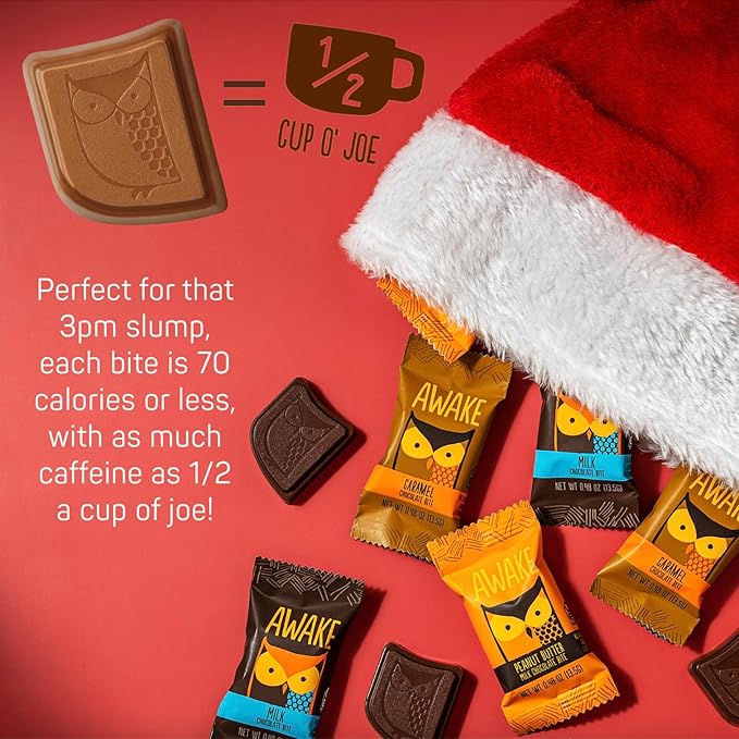 AWAKE - Caffeinated Chocolate Bites - Coffee Alternative - 50mg Caffeine - Energy Bars - Low-Calorie Snacks - Peanut Butter, Milk & Caramel Holiday Variety Pack - 50 Bites