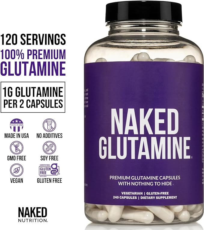 Naked L-Glutamine Muscle Recovery Capsules, 1000mg, 240 Count, Made in The USA, Non-GMO, Gluten and Soy Free