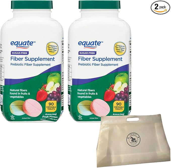 Equate Daily Fiber Sugar Free Prebiotic 90 Chewable Tablets (2 Packs) Bundle with Reusable Food Pouch