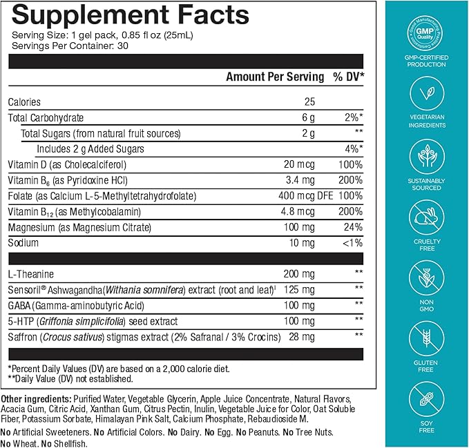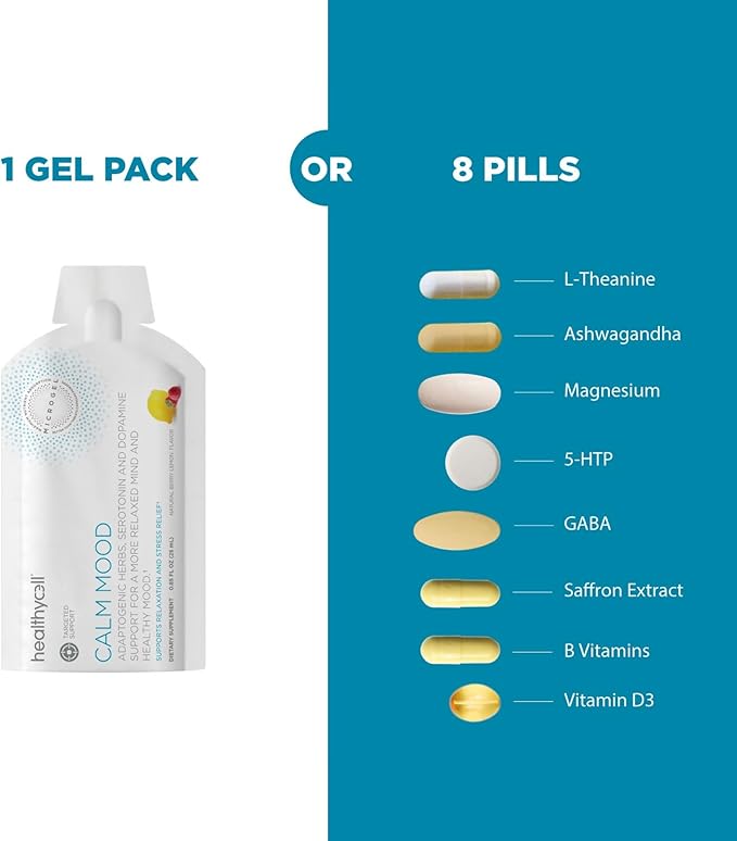 - Replaces 8 Pills: Over 663 mg of relaxing nutrients in one mood-boosting gel pack, including ashwagandha, L-theanine, GABA, Saffron and Magnesium. To get the same effective doses of these nutrients, you would need to swallow over 8 large capsules