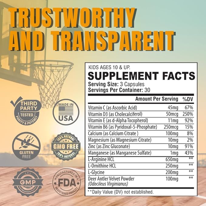 - No Hidden Blends, Full Label Disclosure – Our height growth supplement offers a transparent formula with no proprietary blends, ensuring kids and teens get an honest and effective supplement for height increase and growth. Each ingredient supports overall height growth and development.