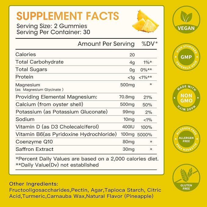 - Premium Nutritional Formula - Magnesium calcium gummies with rich formulas contain Magnesium Glycinate, Potassium, Calcium, Vitamins D3, B6 and so on. Magnesium Glycinate can help with heart stress, Coenzyme Q10 and Potassium improves fatigue, Saffron boosts energy and mood.
