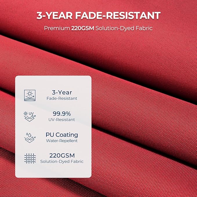 - PREMIUM CANOPY: High-quality 9ft 220gsm solution-dyed fabric with UPF50+ anti-UV coating provides 3-year fade-resistant, 99.9% UV-resistant, and water-repellant properties. Effectively blocks harmful UV rays including UVA and UVB to protect your health.