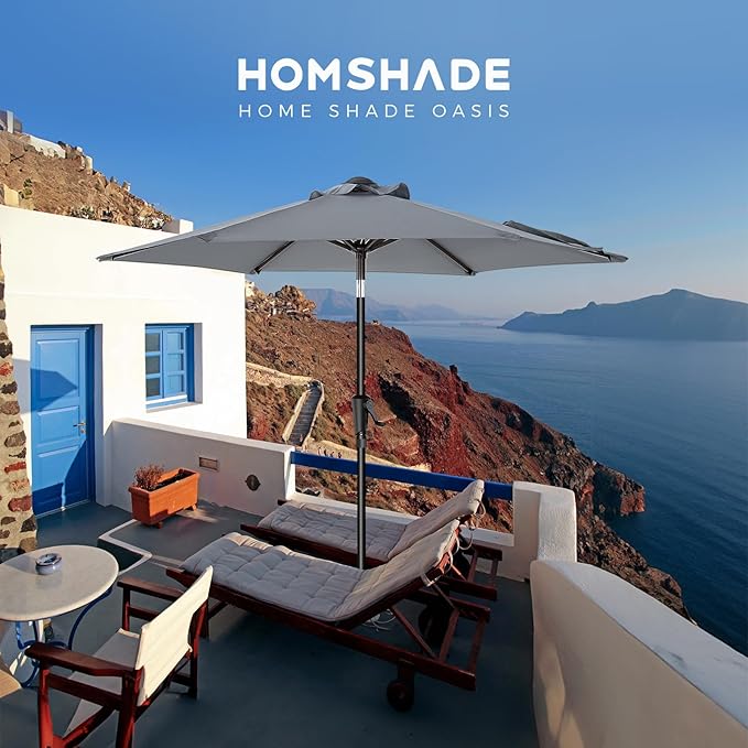 - USE AND MAINTENANCE: The 7.5ft patio umbrella requires a proper base (not included; HOMSHADE umbrella base H12/H13/H14/H15/H16/H17 available). Close and secure it with the strap during strong winds or storage to prolong lifespan.