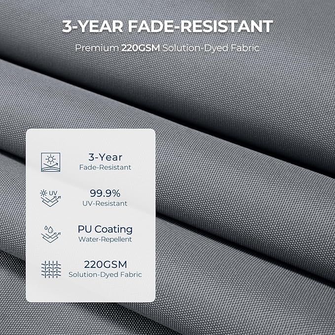 - PREMIUM CANOPY: High-quality 7.5ft 220gsm solution-dyed fabric with UPF50+ anti-UV coating provides 3-year fade-resistant, 99.9% UV-resistant, and water-repellant properties. Effectively blocks harmful UV rays including UVA and UVB to protect your health.