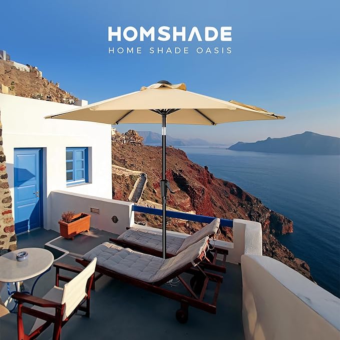 - NICE OUTDOOR OUTLOOK: HOMSHADE 7.5ft classic patio umbrella can greatly add color, cool shade, and cozy atmosphere to your patio and outdoor creative spaces. Suitable for a variety of outdoor environments such as patios, gardens, pools, decks, backyards, and so on. Overall dimensions: 7.5' (diameter) x 6.7' (height)