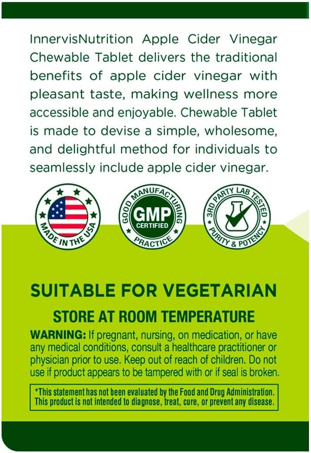 - SUGGESTED USE – Adults take one (1) chewable tablet twice daily. Each serving contains 1000mg of Apple Cider Vinegar, as well as many vitamins good for your health. Store at room temperature. If pregnant, nursing, on medication, or have any medical conditions, consult a healthcare practitioner or physician prior to use. Keep out of reach of children. Do not use if product appears to be tampered with or if seal is broken. Discontinue use and consult your doctor if any adverse reactions occur.