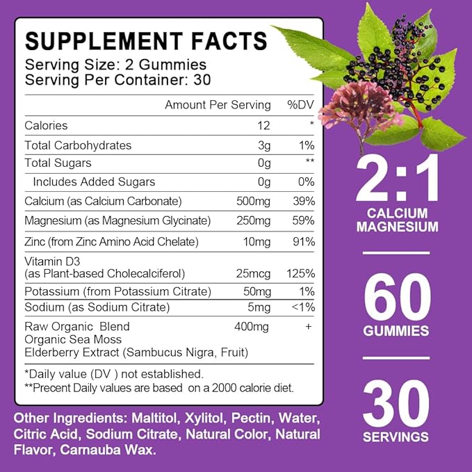 Sugar Free Calcium Magnesium Zinc Gummies with Elderberry and Sea Moss, Calcium Magnesium 2:1, Magnesium Glycinate, Potassium and Vitamin D3 for Bones, Muscles, Calm Mood & Sleep Support, 60 Gummies