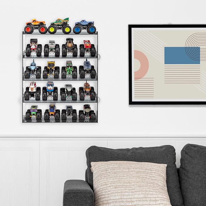 - 5 Levels of Display: This monster truck display case features five levels, each meticulously designed to safely and stylishly display your monster jam trucks. With a capacity of up to 20 trucks, you'll have plenty of room to display your collection.